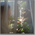 この日は、出窓のでっぱりにふたりして登って、カーテンの向こう側で仲良くひなたぼっこ。